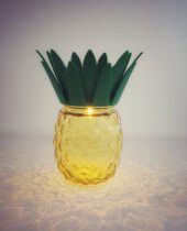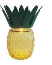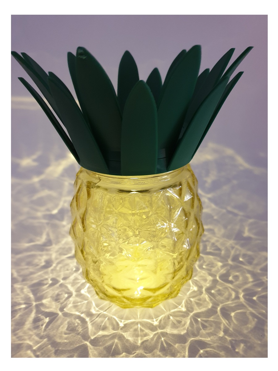 Dekoracja led solarna Ananas ładuje się w ciągu dnia na słońcu, magazynuje energię w akumulatorze, dzięki zastosowaniu czujniku zmierzchu, lampka samoczynnie świeci gdy robi się ciemno